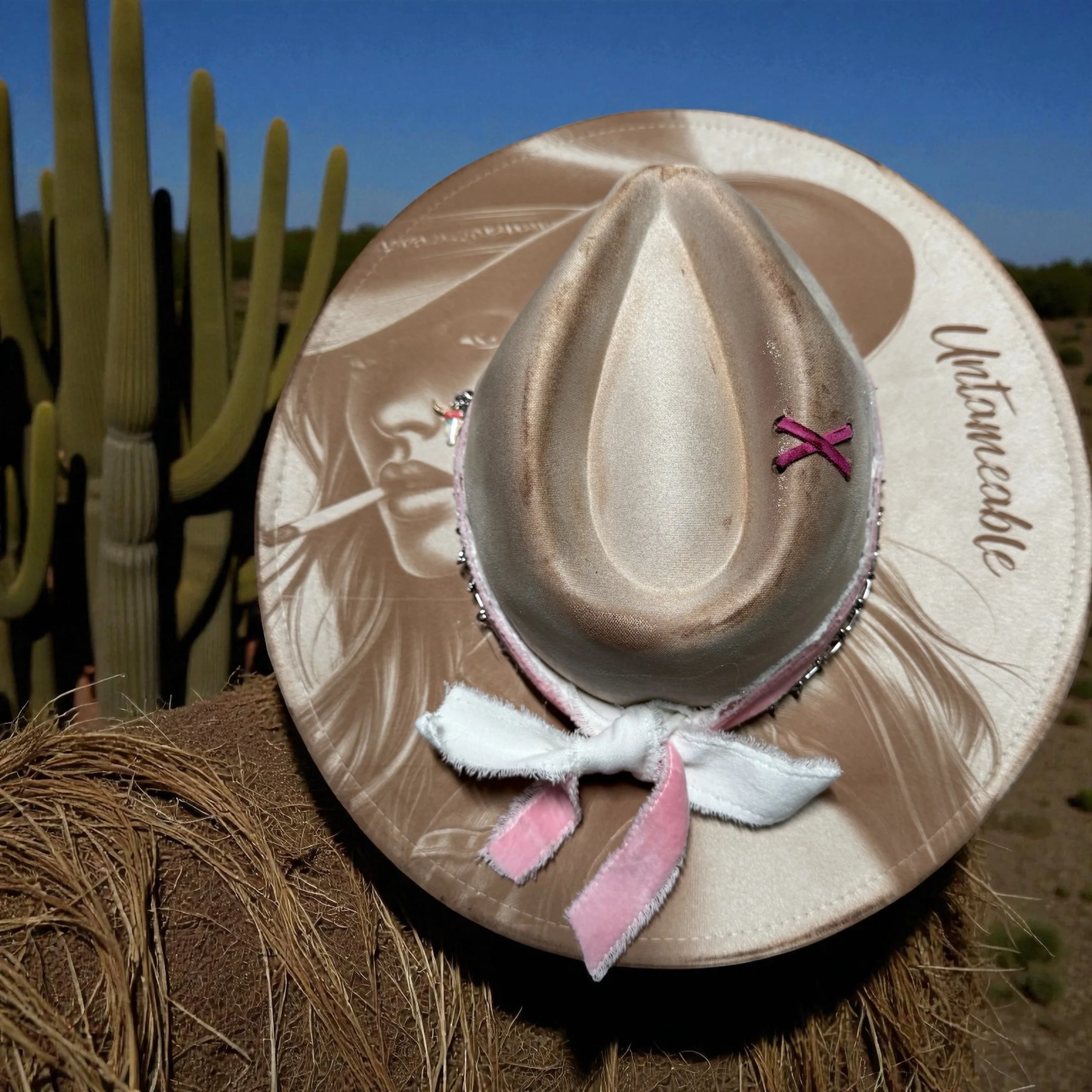 I don’t mass-produce a damn thing. I’m a one-woman wildfire with a torch in one hand 🔥 and a solo cup of wine in the other 🍷, and every single hat I make is an original. Burned, battered, kissed by dragonfyre, dragged through the creative trenches, and dressed up with my signature boho flower 🌼, charms, bands, ribbons, rivets — whatever the hell the muse throws at me that day.
