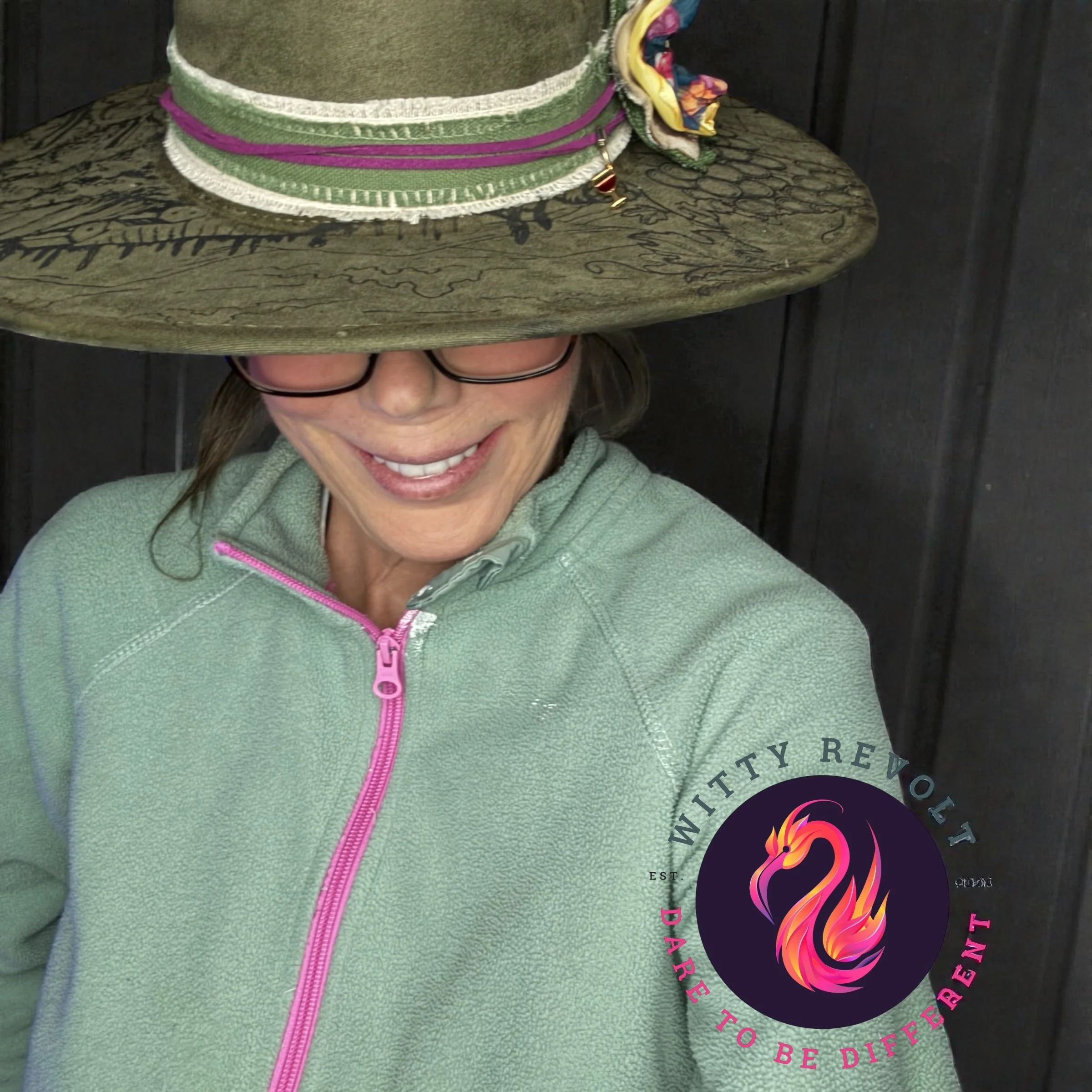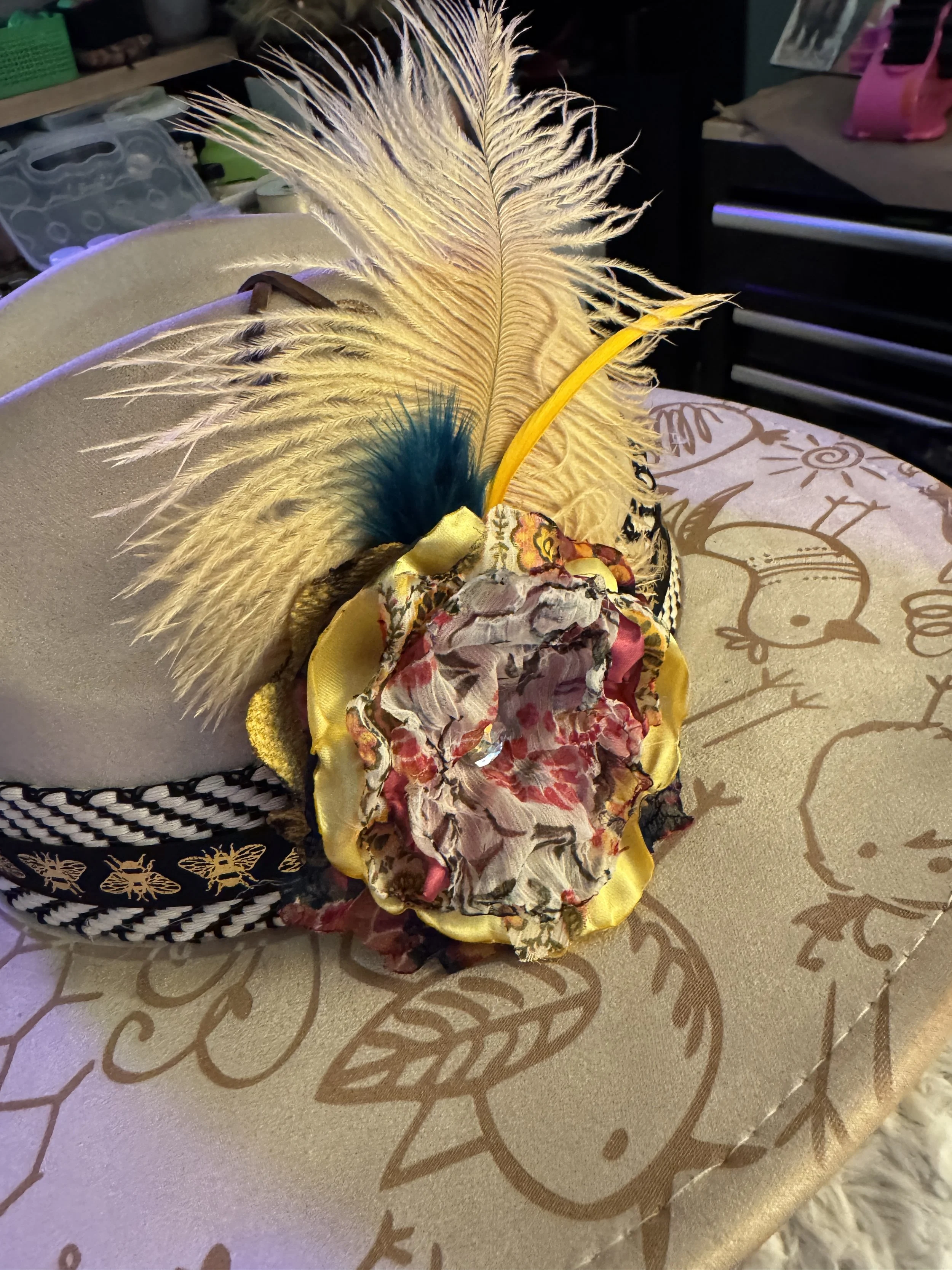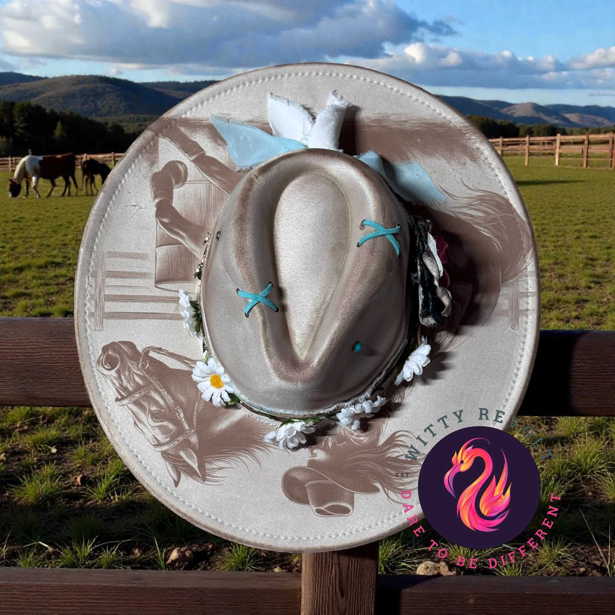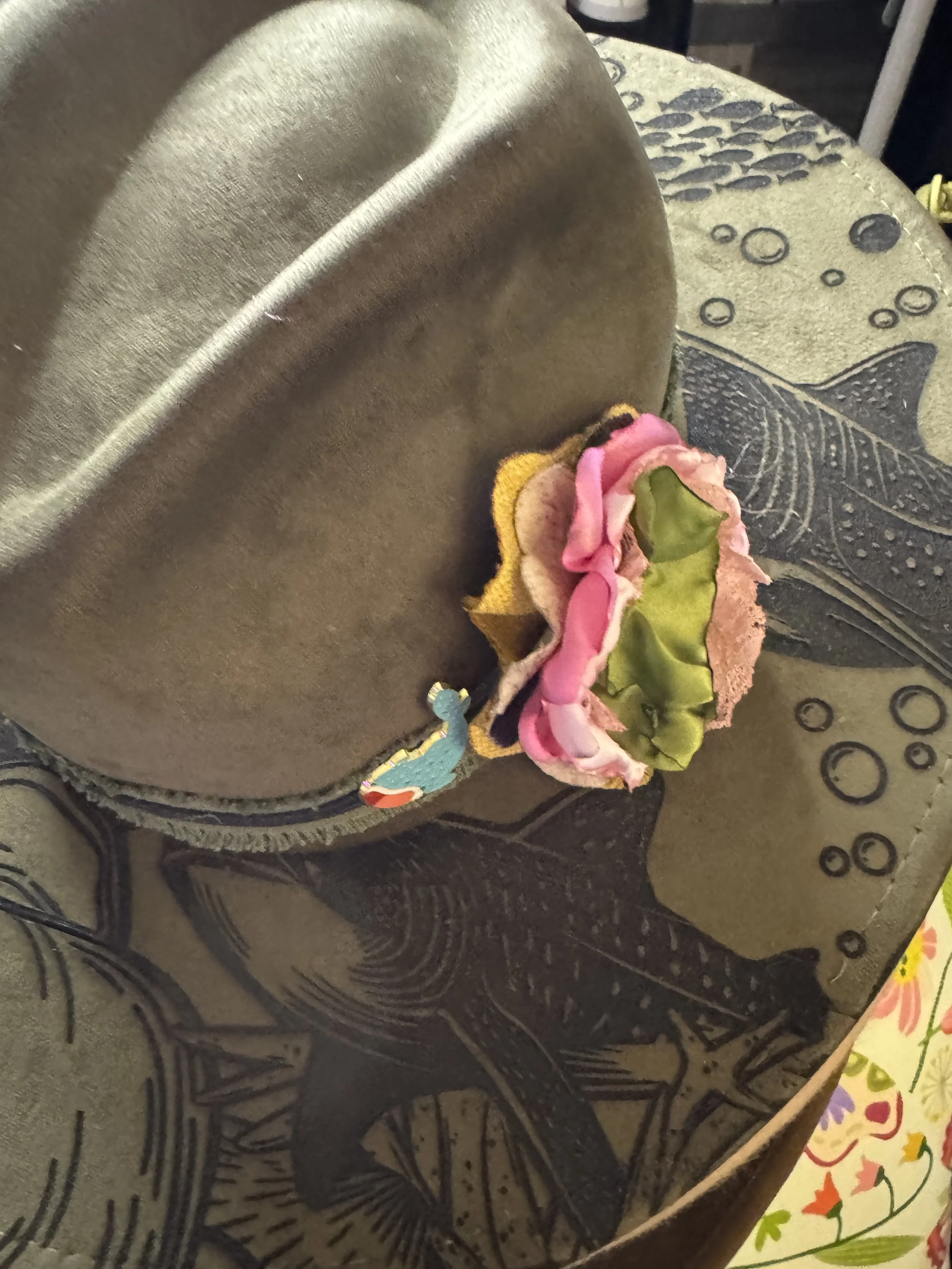 I don’t mass-produce a damn thing. I’m a one-woman wildfire with a torch in one hand 🔥 and a solo cup of wine in the other 🍷, and every single hat I make is an original. Burned, battered, kissed by Dragonfyre (my laser), dragged through the creative trenches, and dressed up with my signature boho flower 🌼, charms, bands, ribbons, rivets — whatever the hell the muse throws at me that day.